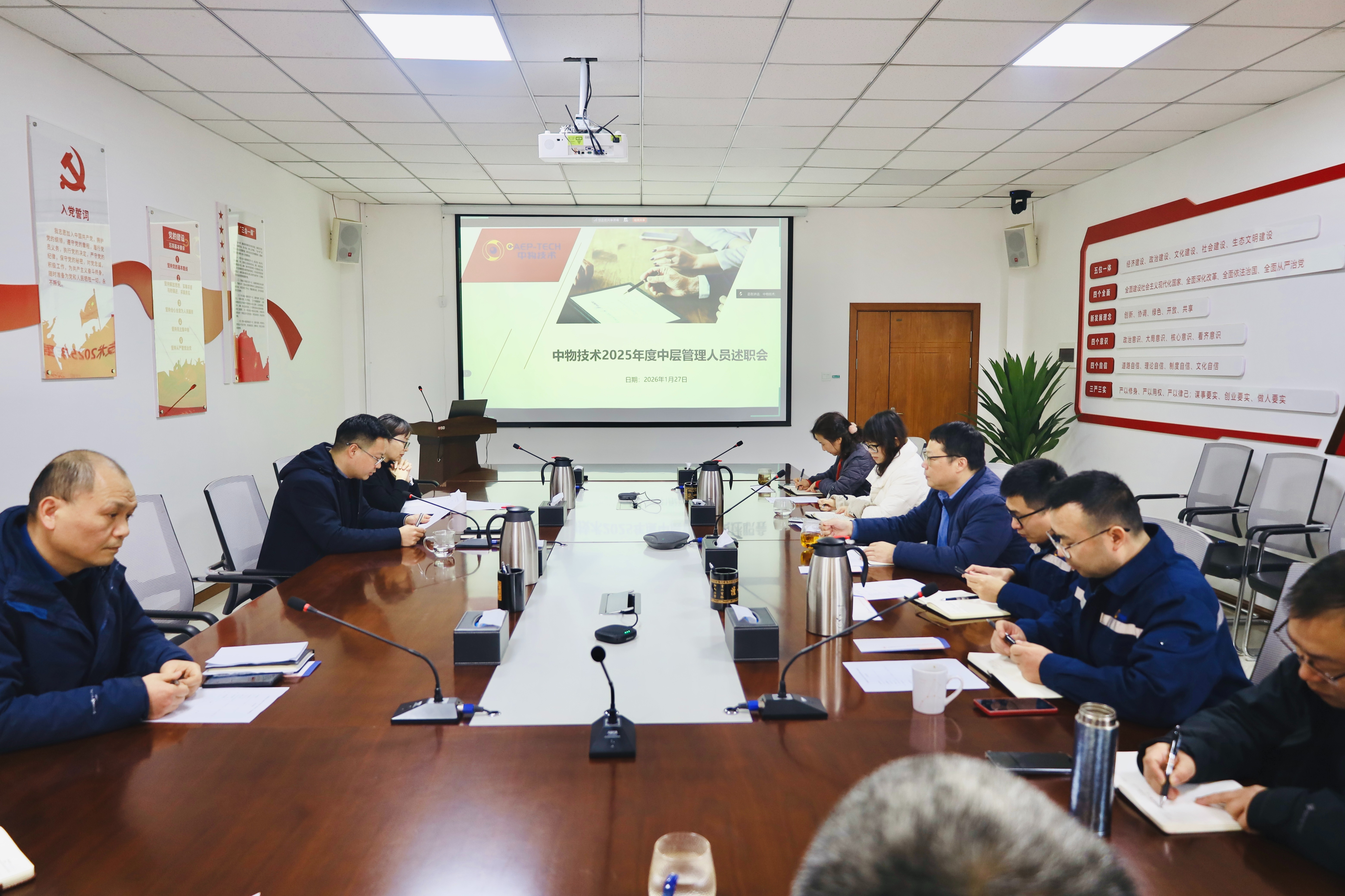 1月27日,中物技术召开中层干部述职大会,全面复盘2025年度工作成效,部署2026年重点任务。党支部书记、总经理王松主持会议,组织委员、副总经理赵莉及全体中层干部参加会议。